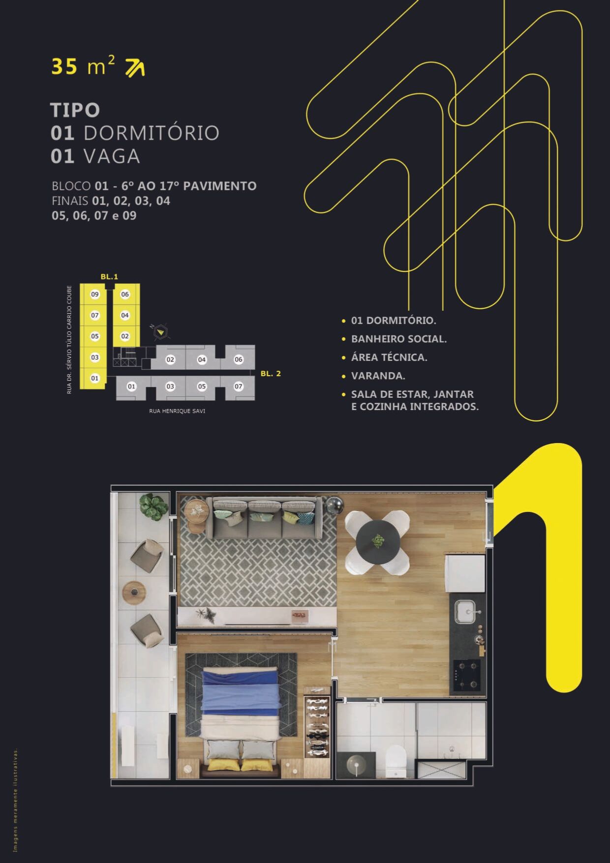 Com 35m² de área privativa , cada detalhe foi cuidadosamente planejado para otimizar o espaço sem abrir mão do conforto. O apartamento conta com: