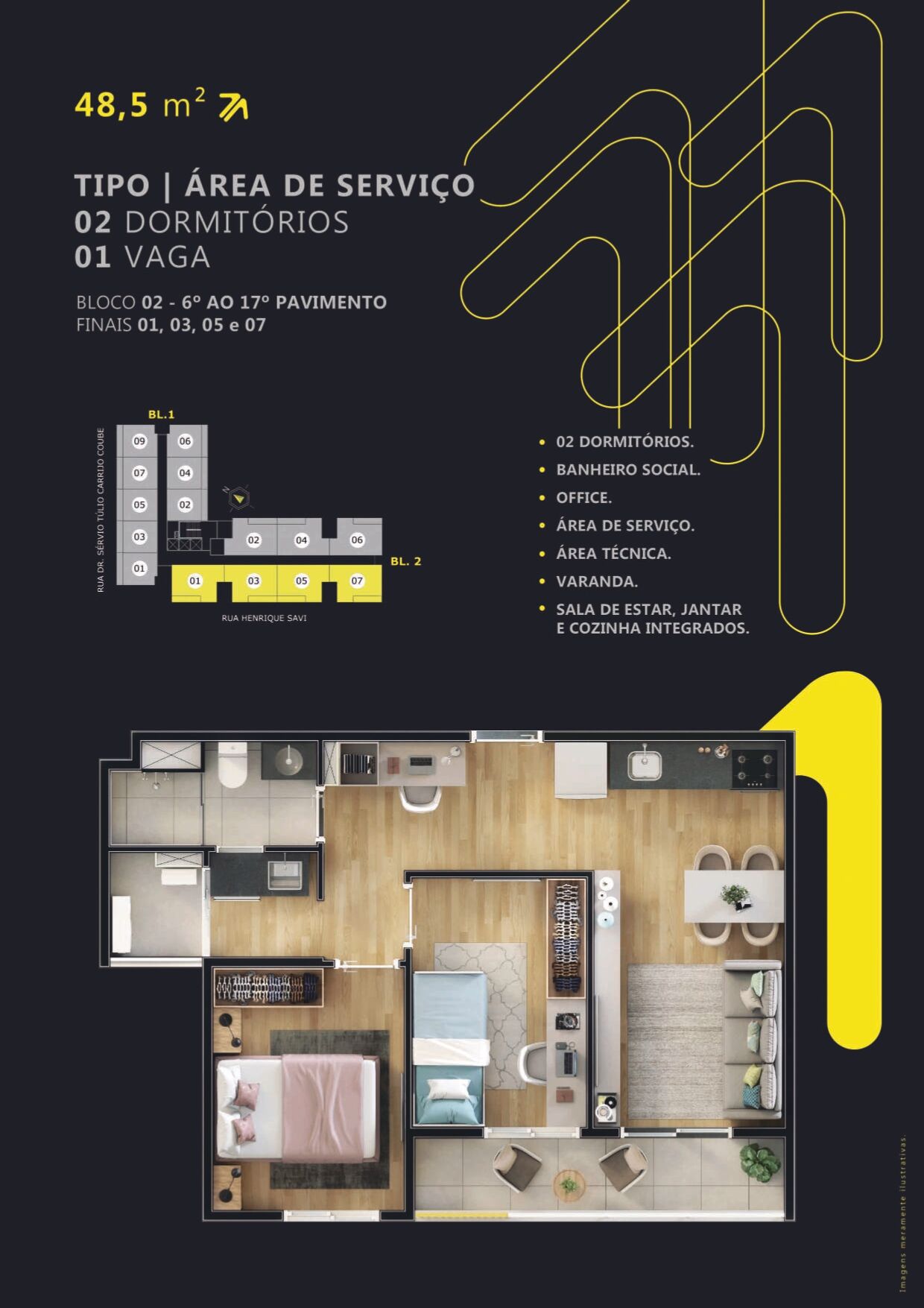 Com 48,50m² de área privativa , cada detalhe foi cuidadosamente planejado para otimizar o espaço sem abrir mão do conforto. O apartamento conta com: